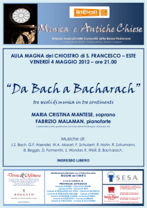 Il M° Fabrizio Malaman accompagnerà al pianoforte la M° Maria Cristina Mantese, soprano, su musiche di J. S. Bach, G. F. Haendel, W. A. Mozart, F. Schubert, R. Hahn, R. Schumann, B. Beggio, D. Formentin, S. Wonder, K. Weill, B. Bacharach.